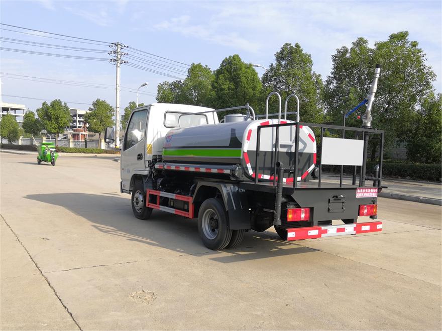 灑水車前裝有鴨形噴嘴或圓頭沖嘴,后面裝有圓柱開灑水噴嘴或蓮蓬頭噴嘴,后部有一工作平臺,裝配有水炮。后部還可裝8個噴嘴(選裝)。