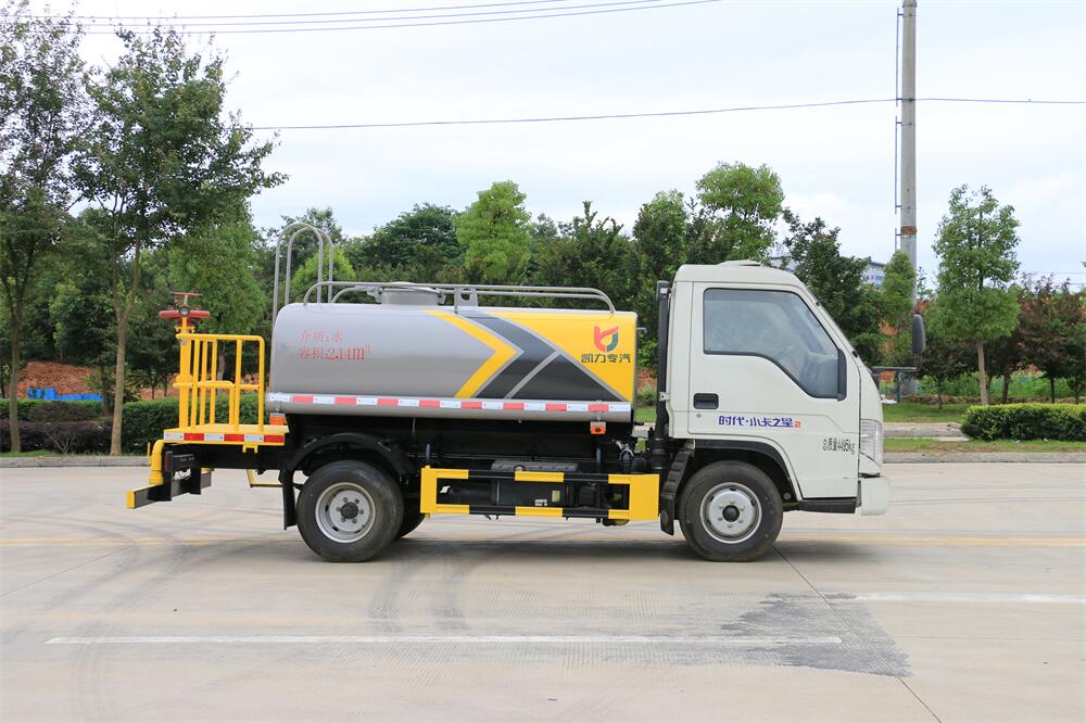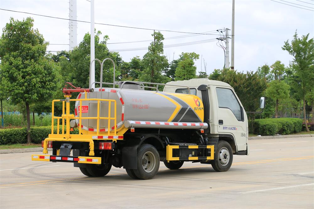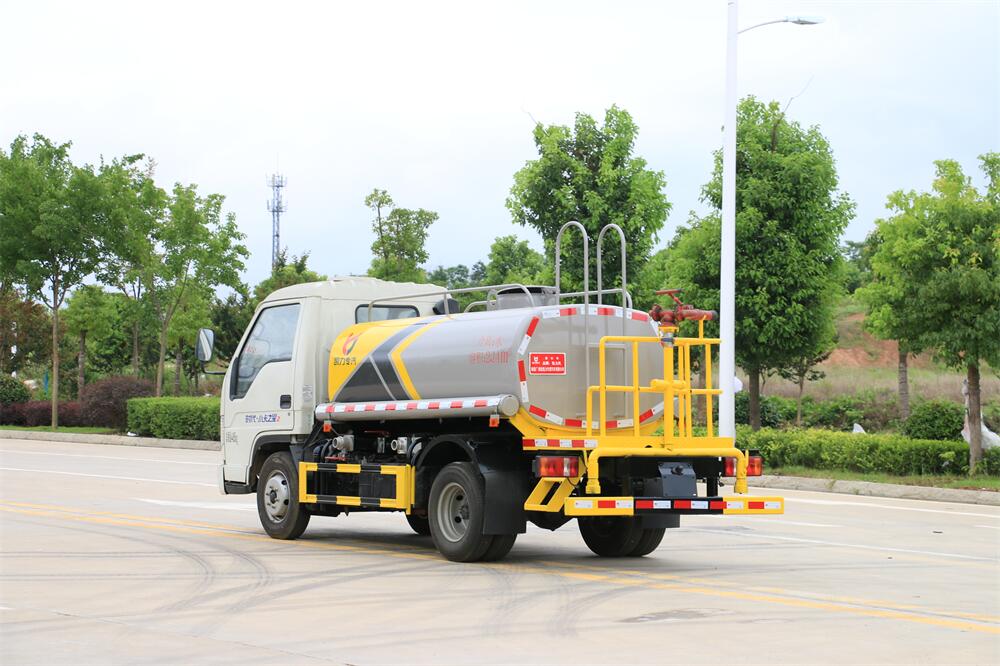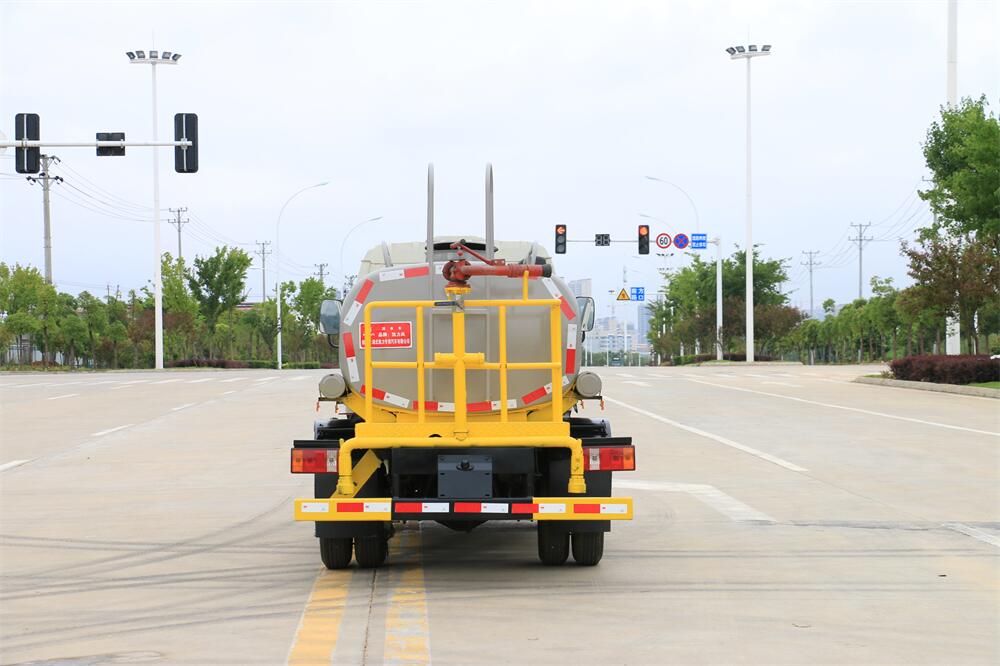 灑水車前裝有鴨形噴嘴或圓頭沖嘴,后面裝有圓柱開灑水噴嘴或蓮蓬頭噴嘴,后部有一工作平臺(tái),裝配有水炮。后部還可裝8個(gè)噴嘴(選裝)。