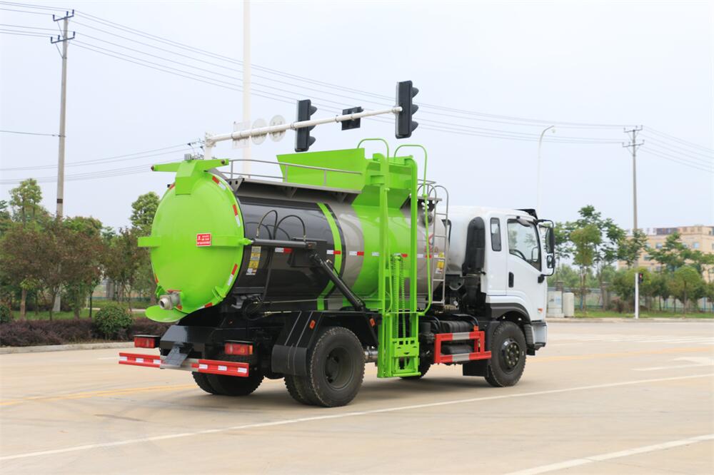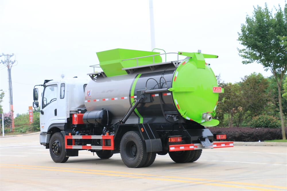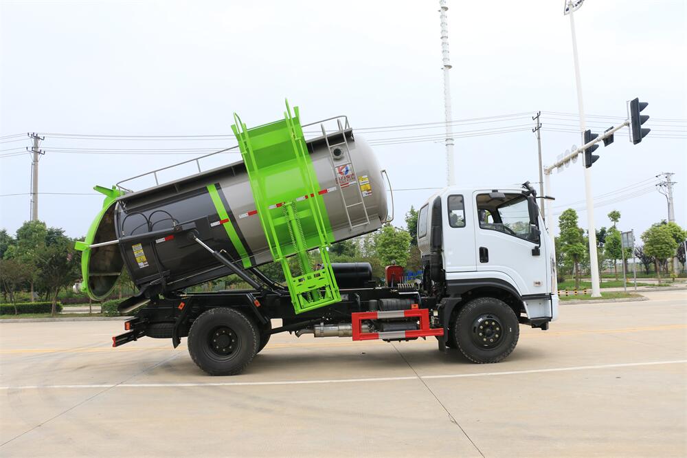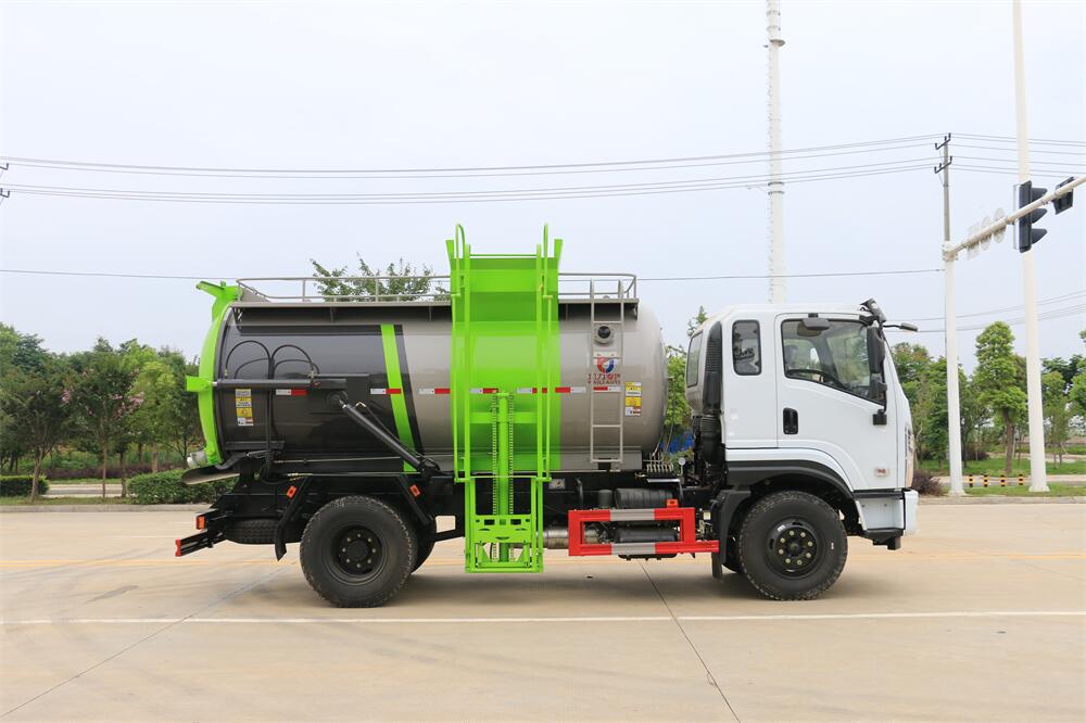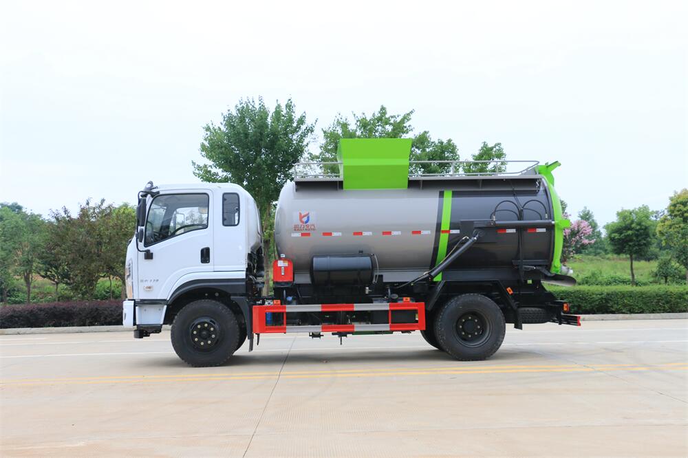 上裝配置:罐體容積10m3,配備120L/240L掛桶提升翻轉機構,液壓系統,后蓋液壓鎖緊開啟,罐體可以舉升自卸,尾部帶自流閥;用于運輸液態垃圾,其特點操作簡單,密封性好,無泄漏,無異味;可選裝固液分離功能,推板擠壓功能,常用于餐館的垃圾轉運處理。