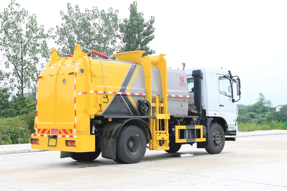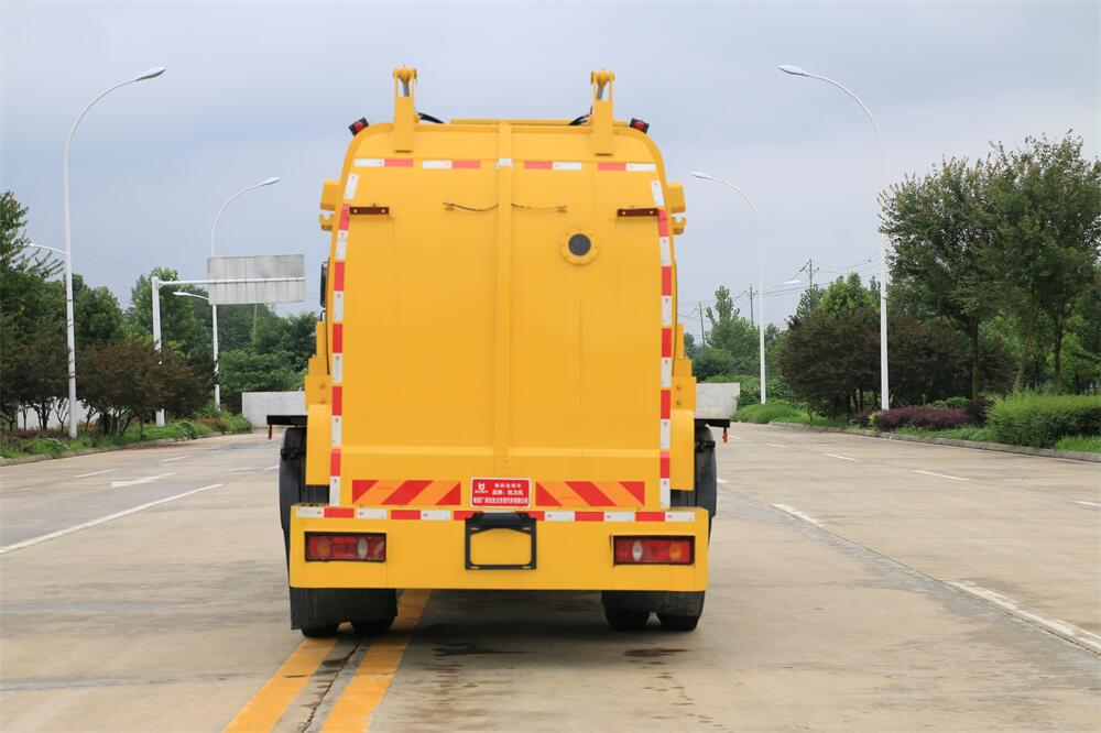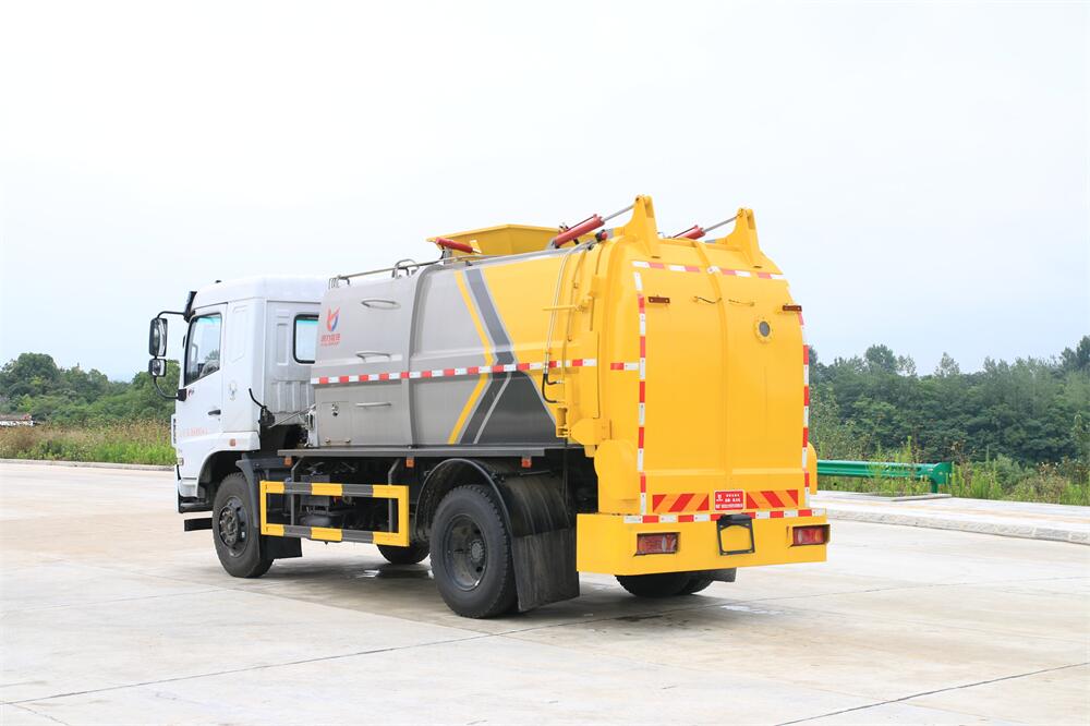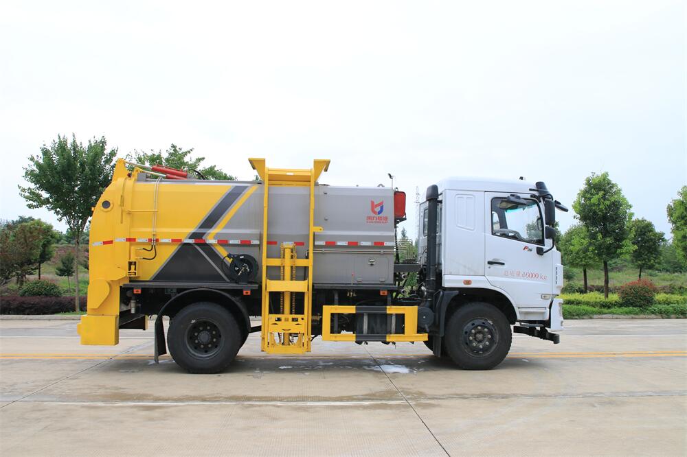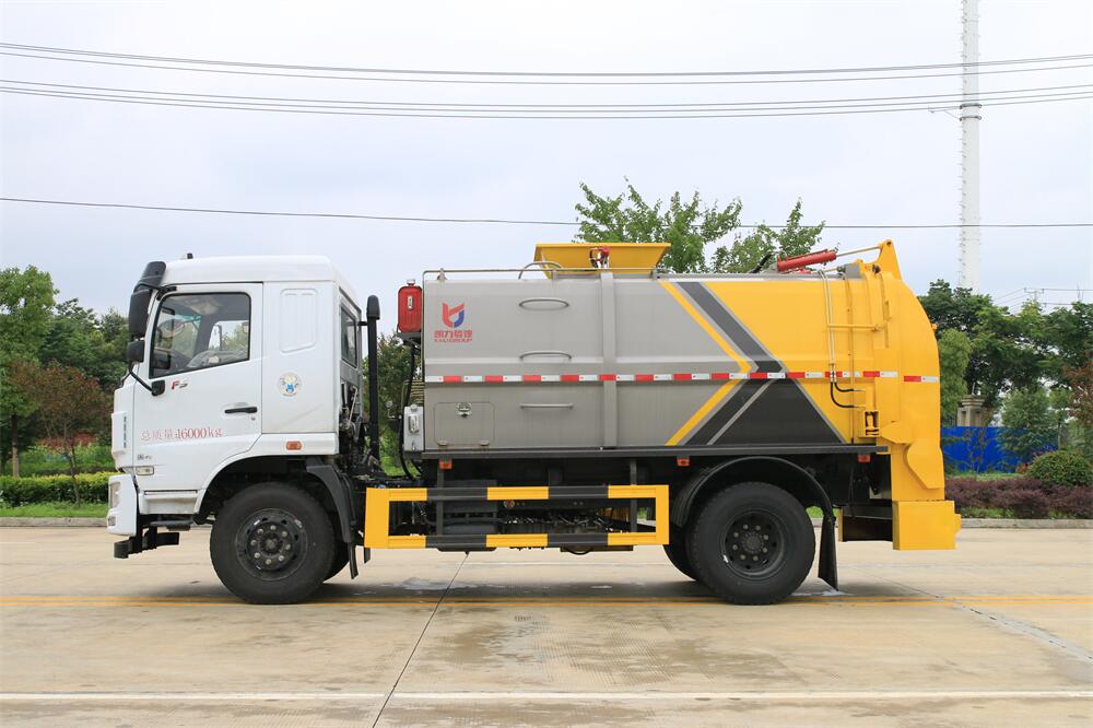 上裝配置:罐體容積10m3,配備120L/240L掛桶提升翻轉機構,液壓系統,后蓋液壓鎖緊開啟,罐體可以舉升自卸,尾部帶自流閥;用于運輸液態垃圾,其特點操作簡單,密封性好,無泄漏,無異味;可選裝固液分離功能,推板擠壓功能,常用于餐館的垃圾轉運處理。