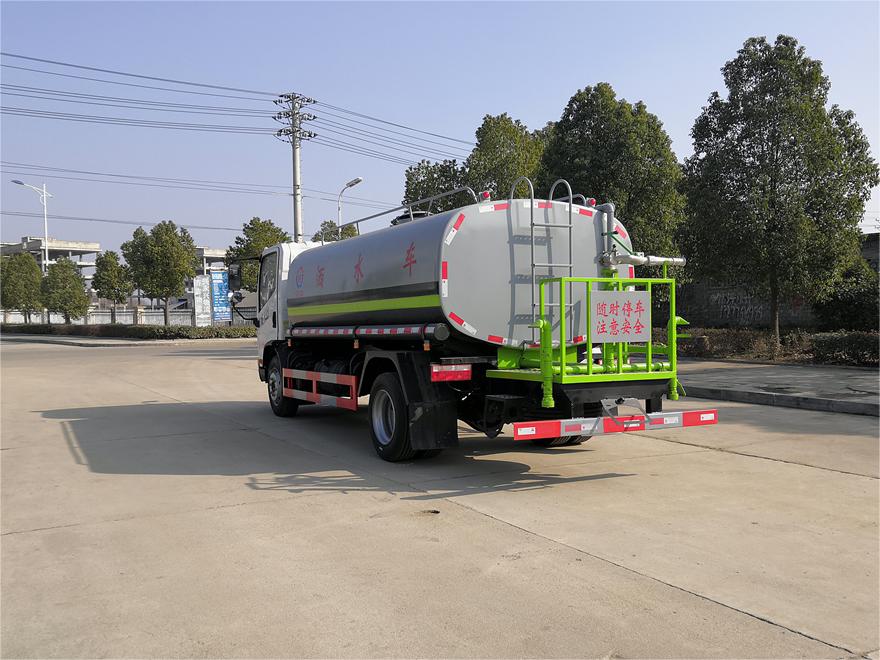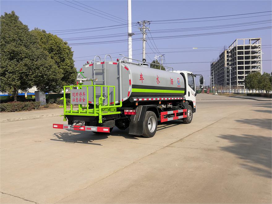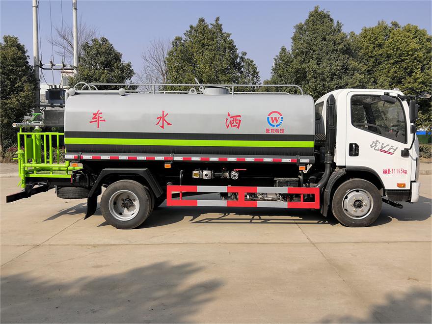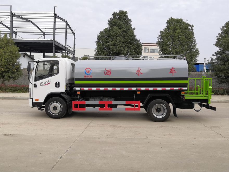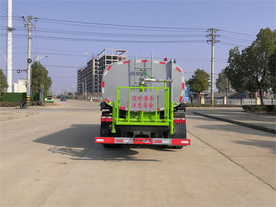 灑水車(chē)前裝有鴨形噴嘴或圓頭沖嘴,后面裝有圓柱開(kāi)灑水噴嘴或蓮蓬頭噴嘴,后部有一工作平臺(tái),裝配有水炮。后部還可裝8個(gè)噴嘴(選裝)。