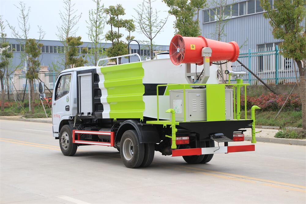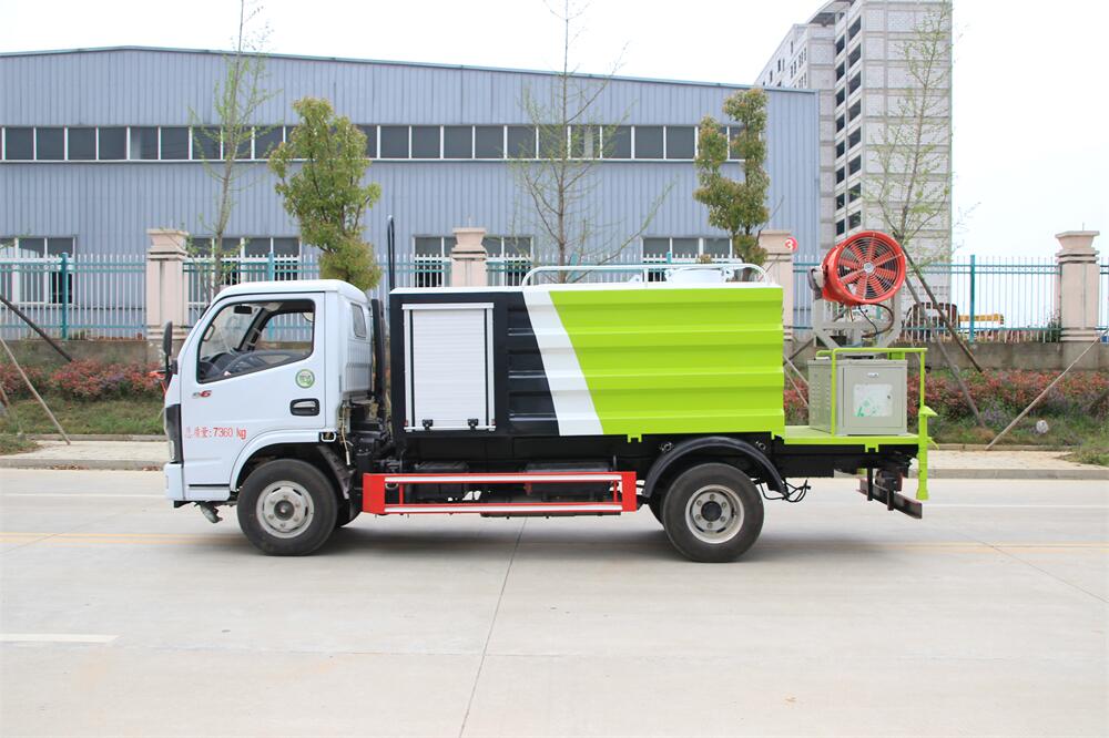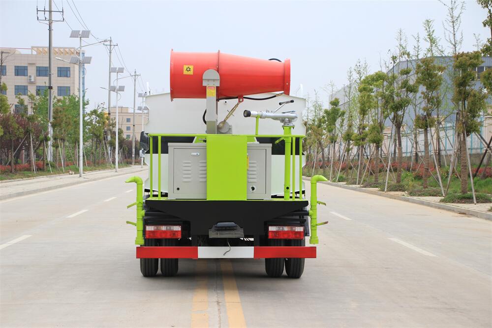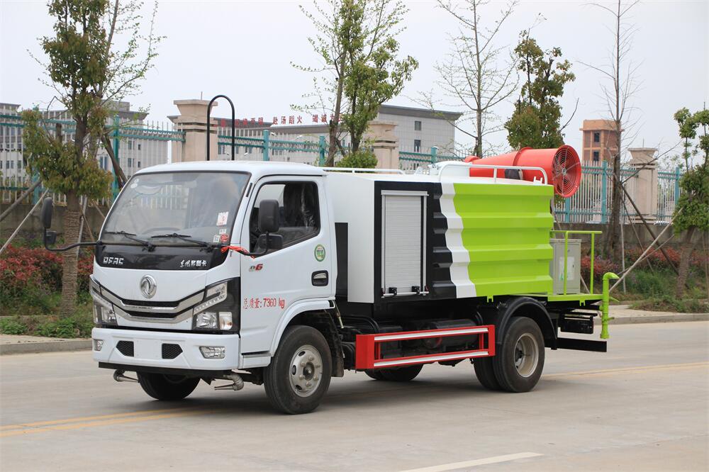 上裝配置:罐體容積為 5-7立方,選配風送式霧炮機組射程30米、40米、50米、60米、80米、100米、120米霧炮,罐體鋼板為4mm碳鋼Q235材質,罐內隔板具有防波作用,以減輕汽車行駛時罐體液體沖擊,罐體及整車外形尺寸按照公告。帶大功率專用灑水泵,泵可自吸自排,整車前沖、后灑、側噴、帶65消防接口,后平臺配CLW-50、CLW-60、CLW-80、CLW-100、CLW-120型風送式霧炮機組;罐體前封頭配大功率柴油發電機組;前封頭帶水位計,后平臺主管路帶1寸澆花接口,后爬梯。帶兩根輸水管及陰陽端。罐體顏色:銀/灰/綠,罐體兩側噴“多功能抑塵車”字樣,貼反光標示。