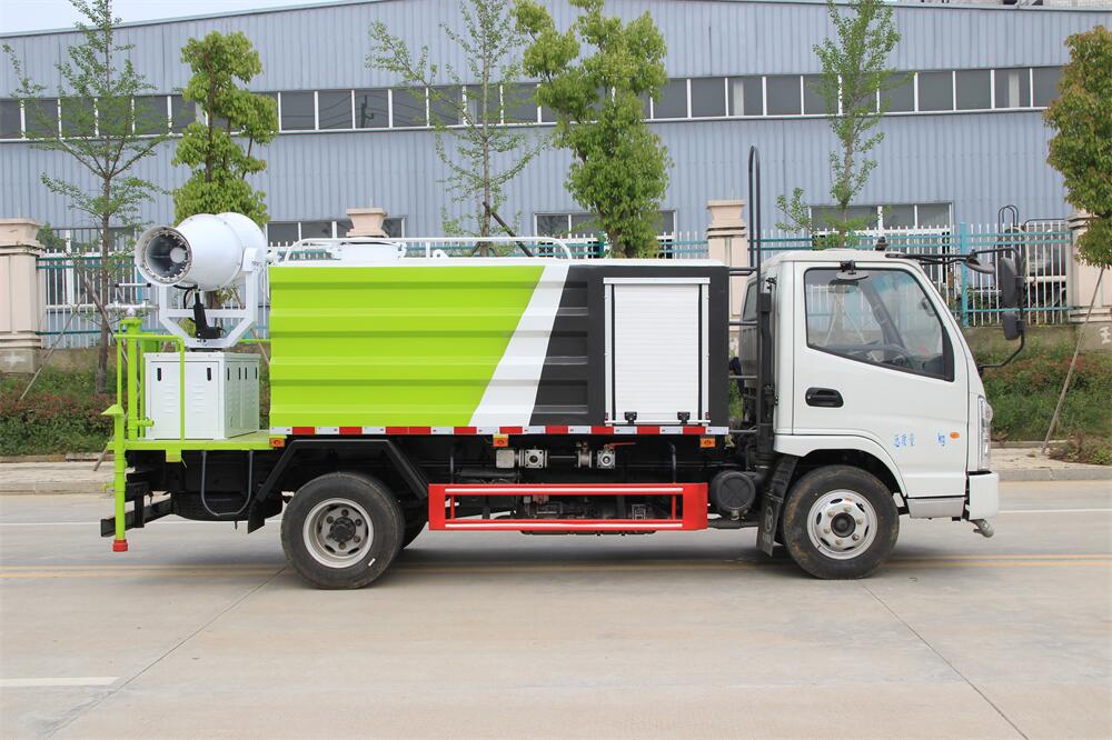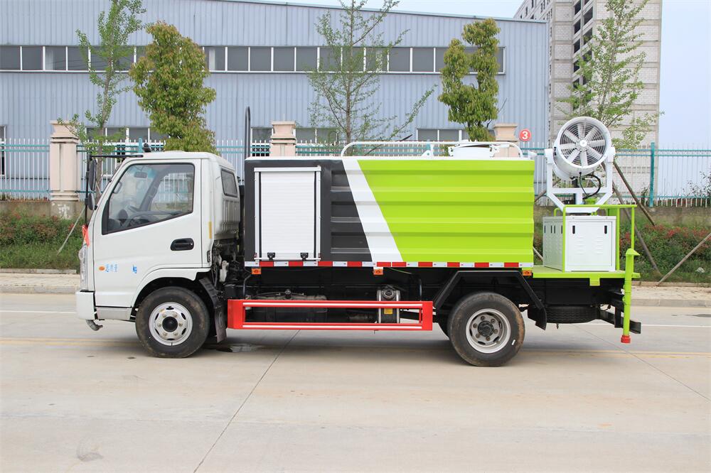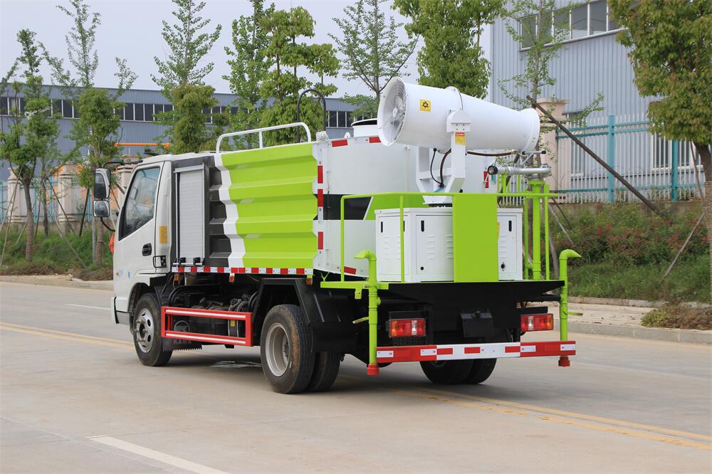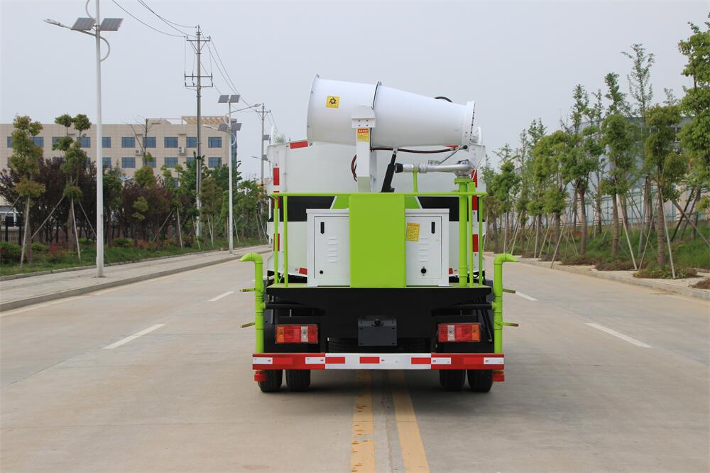 上裝配置:罐體容積為 5立方,選配風(fēng)送式霧炮機(jī)組射程30米、40米、50米、60米、80米、100米、120米霧炮,罐體鋼板為4mm碳鋼Q235材質(zhì),罐內(nèi)隔板具有防波作用,以減輕汽車行駛時(shí)罐體液體沖擊,罐體及整車外形尺寸按照公告。帶大功率專用灑水泵,泵可自吸自排,整車前沖、后灑、側(cè)噴、帶65消防接口,后平臺配CLW-50、CLW-60、CLW-80、CLW-100、CLW-120型風(fēng)送式霧炮機(jī)組;罐體前封頭配大功率柴油發(fā)電機(jī)組;前封頭帶水位計(jì),后平臺主管路帶1寸澆花接口,后爬梯。帶兩根輸水管及陰陽端。罐體顏色:銀/灰/綠,罐體兩側(cè)噴“多功能抑塵車”字樣,貼反光標(biāo)示。