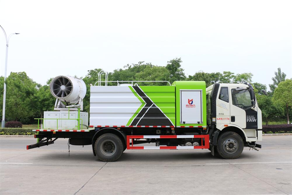 上裝配置:罐體容積為 12立方,選配風(fēng)送式霧炮機組射程30米、40米、50米、60米、80米、100米、120米霧炮,罐體鋼板為4mm碳鋼Q235材質(zhì),罐內(nèi)隔板具有防波作用,以減輕汽車行駛時罐體液體沖擊,罐體及整車外形尺寸按照公告。帶大功率專用灑水泵,泵可自吸自排,整車前沖、后灑、側(cè)噴、帶65消防接口,后平臺配CLW-50、CLW-60、CLW-80、CLW-100、CLW-120型風(fēng)送式霧炮機組;罐體前封頭配大功率柴油發(fā)電機組;前封頭帶水位計,后平臺主管路帶1寸澆花接口,后爬梯。帶兩根輸水管及陰陽端。罐體顏色:銀/灰/綠,罐體兩側(cè)噴“多功能抑塵車”字樣,貼反光標示。
