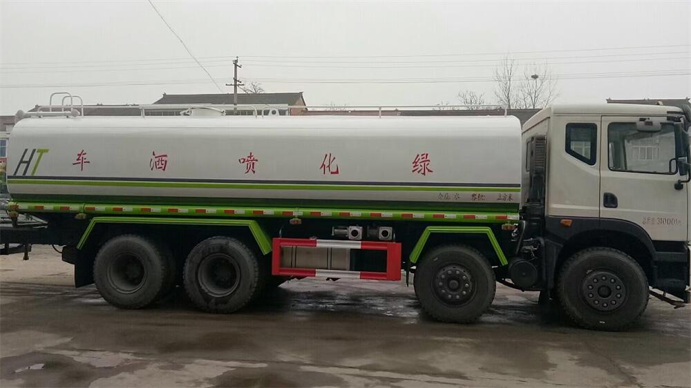 灑水車前裝有鴨形噴嘴或圓頭沖嘴,后面裝有圓柱開灑水噴嘴或蓮蓬頭噴嘴,后部有一工作平臺(tái),裝配有水炮。后部還可裝8個(gè)噴嘴(選裝)。